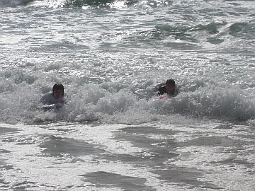 | Nachts regnete es leider etwas. Es dauerte bis Mittag, bis die Wolken aufrissen. Dann aber wurde es wieder angenehm warm und wir verbrachten den Nachmittag mit unseren Boards am Strand. | |