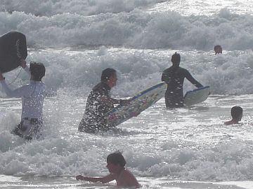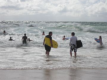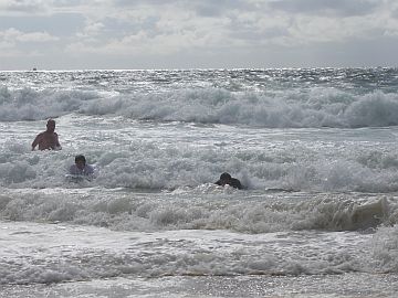 | Nachts klopfte wieder der Regen auf Womo und Zelt. Deshalb fuhren wir mit den Rädern am Vormittag nach Lacanau Océan. Doch am Nachmittag ging es schon wieder in die heute fast perfekten Wellen. | |