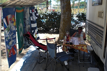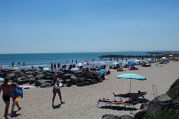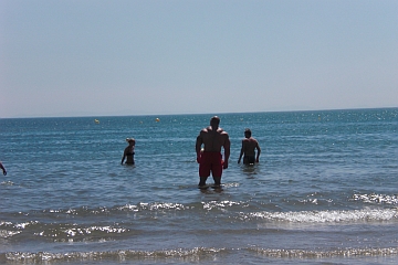 | Wir hatten hier, wie bereits erwähnt, eine komplett andere Erinnerung an diesen Platz. Es war bis 03:00 Uhr früh Leben. Danach, so ab 04:00 Uhr wenn man dann doch noch etwas schlafen wollte, kam die Müllabfuhr und die Straßenreinigung ... Dies ist keine Kritik, sondern einfach eine wertfreie Feststellung. Doch wir wollten einige Tage hier stoppen, um etwas im Mittelmeer zu baden und Sonne zu tanken. Irgendwie war das mit dem Baden auch anders, als wir uns das vorgestellt hatten. Das Wasser war A...kalt. So gefühlte 17-18°. Doch auf dem Sand konnte man nicht laufen, da er knallheiss war. Also über 30° Außentemperatur stand einem eiskalten Meer gegenüber. So standen die Leute bis zum Knie im Wasser, aber nur die ganz Harten schwammen auch ... irgendwie ein lustiges Bild. So fanden im seichten Wasser sämtliche Aktivitäten, wie Ball- und Fresbeespiele, Strandtennis, etc., statt. Irgendwie waren wir dann nach ein paar Tagen auch der Meinung, jetzt weiter zu fahren. | |