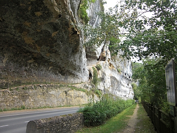 (Auszug aus dem Original-Text) umfasst. So wanderten wir heute auf der sehr gut ausgeschilderten Wanderung zu einigen der Sehenswürdigkeiten des Vézère-Tales über Les Eyzies de Tayac - Abri de Cro-Magnon - Fort de Tayac (Roc de Tayac) - Abri de Poisson - Grotte du Grand Roc - Laugerie Basse - Laugerie Haute - La Micoque und wieder zurück. Das Wetter war leider wieder recht durchwachsen, es nieselte immer wieder leicht, aber es war angenehm warm. Die Wanderung ist wirklich zu empfehlen. Unterwegs hatten wir mit einem kleinen, übermotivierten Terrier zu tun, der seinen Bauernhof mit fletschenden Zähnen verteidigte. Er ließ uns dann doch vorbei, sonst hätte es anbends bei uns wohl Schaschlik gegeben ... |
