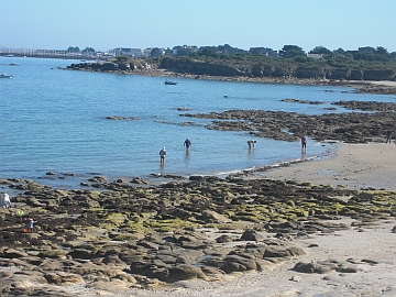 | Schweren Herzens verließen wir den schönen Stellplatz und die Côte Sauvage, um die Kühlergeschichte anzugehen. Nachdem wir nicht wussten, wie stark der Kühler beschädigt war, suchten wir im Internet nach einer Werkstatt und fuhren in diese Richtung auf einen nahen Zeltplatz an der flachen Ostseite, dem Plage Bretonne, oder Strand von St. Julien. Leider hatte diese erst wieder am Montag geöffnet, heute war Sonntag. Aber die kurze Strecke schafften wir am Tag drauf auch mit einem undichten Kühler. Thema erledigt, Tag genießen! Wir fanden einen Hinweis auf den 15 Kilometer langen Radweg "Bouclé de Quibéron", der über die Halbinsel führte. Diesem folgten wir bei erneut herrlichem Wetter. Danach spazierten wir neben dem Zeltplatz, diesmal von der anderen Seite kommend, Richtung des schönen Ortes Quibéron. Mit einem Grill- und Spieleabend beschlossen wir den ausgefüllten Tag. | |