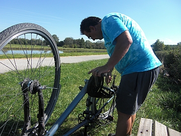 | Sehr früh war noch viel Nebel, aber es zeichnete sich ein erneut herrlicher Tag ab.So fuhren wir "über die Dörfer" nach Châtel-Censoir am Canal du Nivernais. Dort liegt der städtische Campingplatz direkt am Kanal. Es waren fast keine Gäste mehr da, aber es kündigte sich eine Sportklasse mit über fünfzig Leuten an. Diese waren zwar zahlenmäßig groß vertreten aber weil es sich um eine Sportschule für irgendwelche Jungprofis handelte, war da absolute Ruhe - die waren noch vor uns in der Koje, weil sie früh raus mussten. Wir hatten aufgrund der totalen Stille schon Angst, dass hier Drogen im Spiel sind. So ruhig dürfen Jugendliche eigentlich nicht sein. Da schlafe ich ja ganz unruhig! Wir betätigten uns auch sportlich, einerseits durch eine Radtour, andererseits durch flicken eines Plattfußes. Der Besuch hier stand schon seit unserem Besuch am Canal Centre auf unserer Liste - und wir wurden nicht enttäuscht. Es ist wirklichj schön hier. Die Landschaft erinnert uns etwas ans Altmühltal, aber mir seinem eigenen Reiz. | |